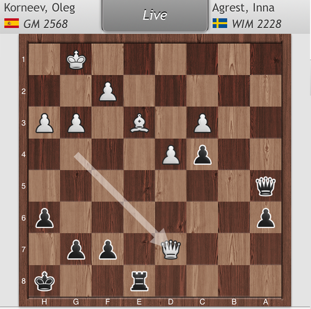 Inna har precis spelat 28.  – Dd6 för att avvärja hotet Lxh6. Korneev ser dock mycket bekymrad ut och onekligen har Inna en hård press med sina löpare och dam på Korneevs kungsflygel. 29. Txb8? Dxb8 och Inna skall nu försöka ro vinsten i land.