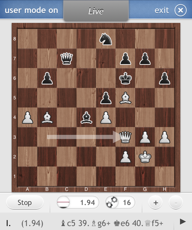 Fiktiv ställning efter 34. – Dc7 35. Db3 Kg6 36. Lg4 Dc7 37. Lf5 Kf6 38. Df3.